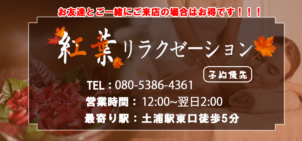 店舗好評口コミ上昇!!!★土浦駅新町紅葉リラクゼーション(モミジリラクゼーション) 予約優先リラクゼーション★